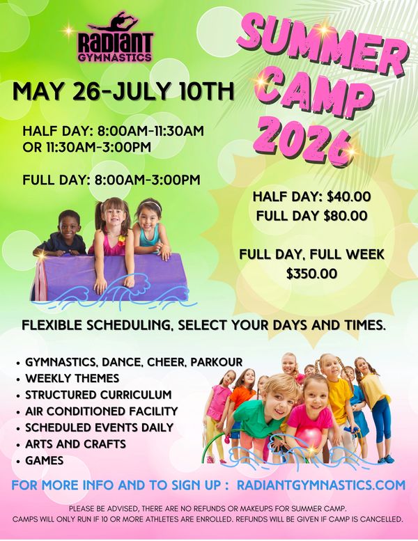 o Our facility is under constant video surveillance to ensure the safety of our athletes and our staff. Video surveillance will never be shared with clients/parents/other. By registering for camp/classes/events you are giving Radiant Gymnastics the permission to take photos/videos to be used for advertisements and publicity, including social media. Images and videos are strictly property of Radiant Gymnastics and will not be sold.
